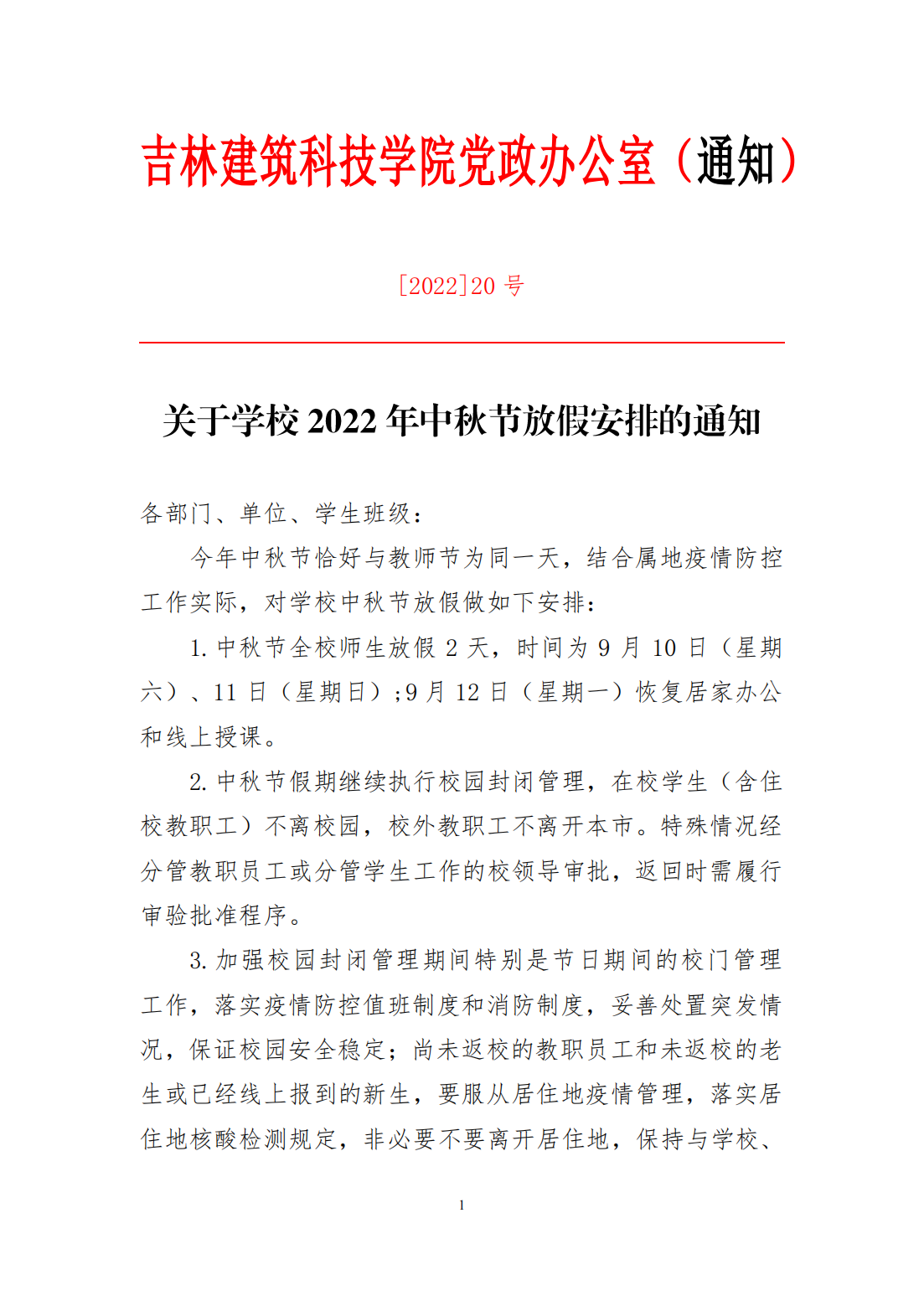 】关于学校2022年中秋节放假安排的通知