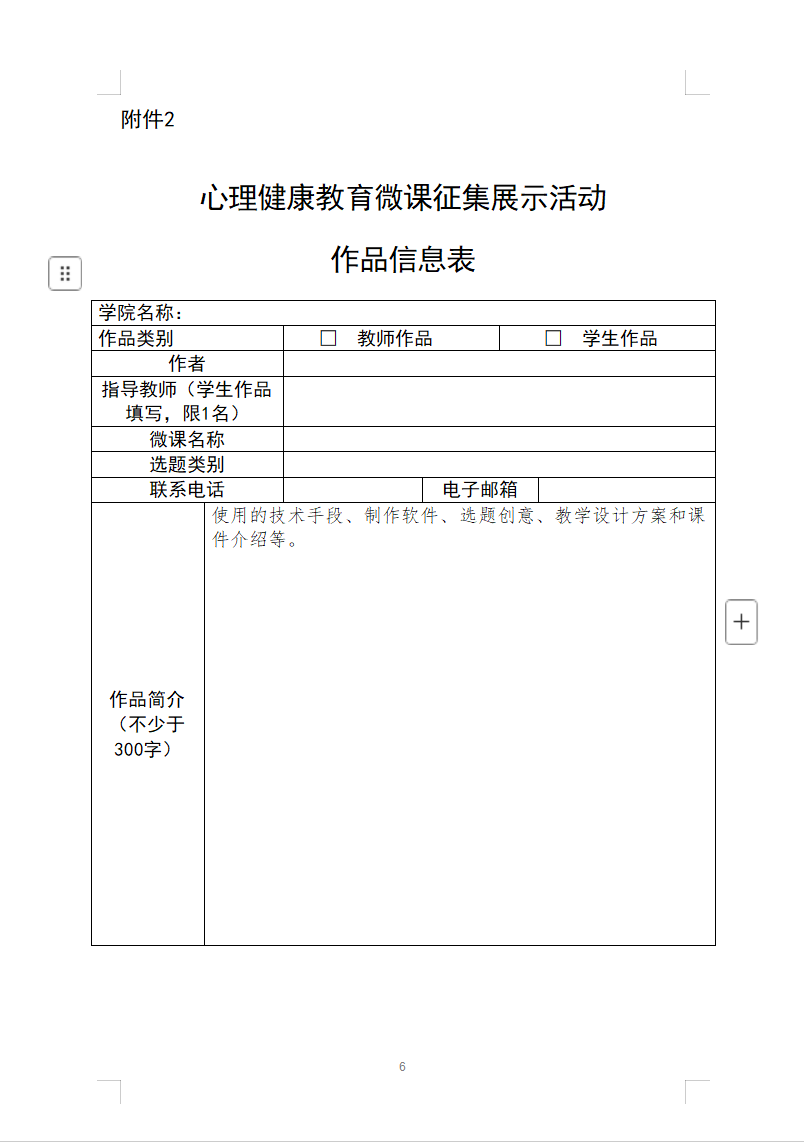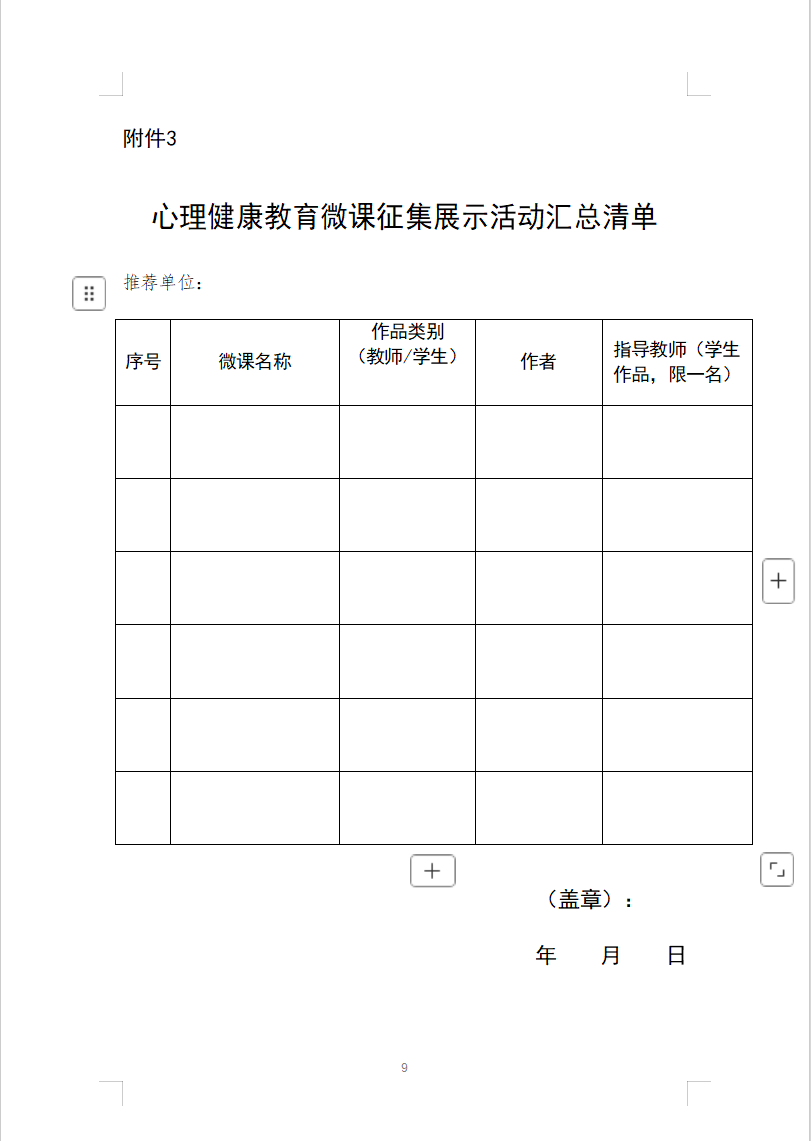 3.微课视频、配套资料包含《心理健康教育微课征集展示活动作品信息表》(附件2、WORD版本)、《心理健康教育微课征集展示汇总清单》(附件3、JPG盖章版本),经推荐单位审核同意、签字盖章后,于4月30日前上报至心理中心。