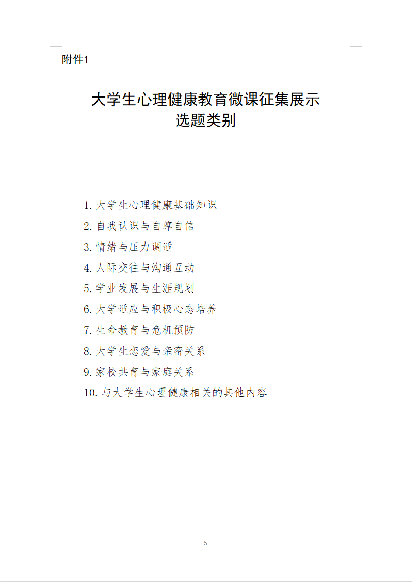 选题方向应从《大学生心理健康教育微课征集展示选题类别》(附件1)中确定,可在相应类别下细化具体内容,精心进行教学设计、课程讲授、视频制作,创作出与大学生学习生活密切相关的心理健康教育微课。