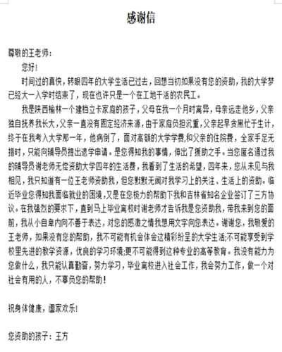 管理工程学院的王方同学从大一至今,一直受到我校一名校领导的资助,素未谋面的资助让他心中不胜感激。