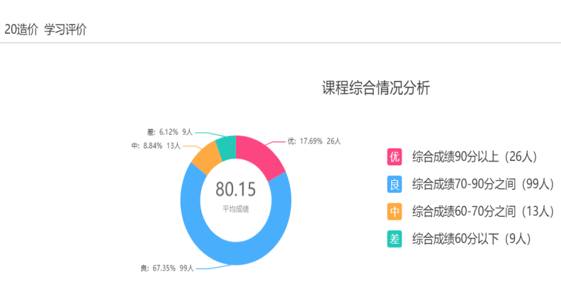 学生在课程进行过程中的评价除了线下考勤、作业等考核指标外,线上学习情况是平时成绩的重要依据之一。学生在线上学习的各项数据均有详尽的记录,例如进入课程的次数、讨论区发帖回帖的数量、学习教学材料的次数、课程视频的观看数量与时长、参与问卷的次数、完成节次测试的情况等都将作为线上学习评价依据,统计以上数据,根据每项数据的完成情况,综合量化打分,给出线上学习平时成绩。