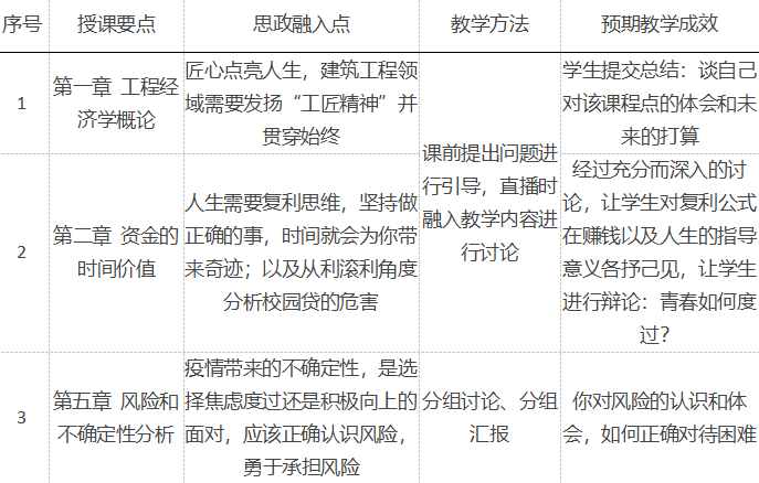 结合《工程经济学》课程专业教学目标和思政育人目标,通过对教学内容的梳理和分解,以下从课程内容中选取了三个教学模块,并将每一个教学模块与思政教育进行适当结合,通过线上讨论的形式融入课程内容并潜移默化地融入对学生的教育中,如表1。