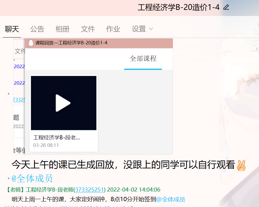 通过QQ群课堂有针对性地讲授课程内容,直播中以答疑、弹幕点名等方式,在教学过程中增加互动环节,通过学生的反馈实时调整上课节奏,掌握课堂效果。同时,在重点、难点部分以选择题或判断题的形式进行小测试,以便了解学生对知识点的掌握程度,从而针对性地解答,提高教学质量,提升学生课堂兴趣,如图7。由于部分学生网络条件不够,无法观看直播,还可以通过观看回放进行学习,如图8。