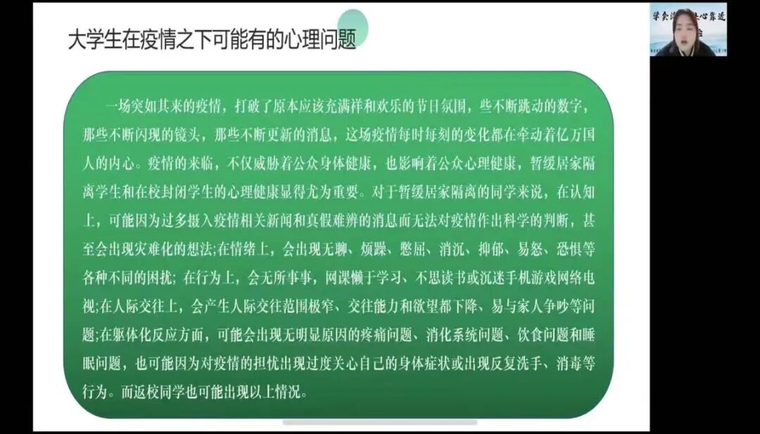 最后由汪小杨老师对会议进行了总结,她再次强调心理健康至关重要,在日常生活中一定要注意心理健康,出现问题,随时提出,及时调节,还向同学们推荐了心理健康相关书籍,希望同学们可以做自己情绪的主人,在遇到困难时,能够主动和家人、老师、朋友沟通倾诉,共同解决问题,重新感受生活的美好。
