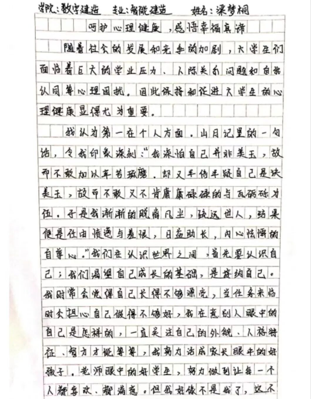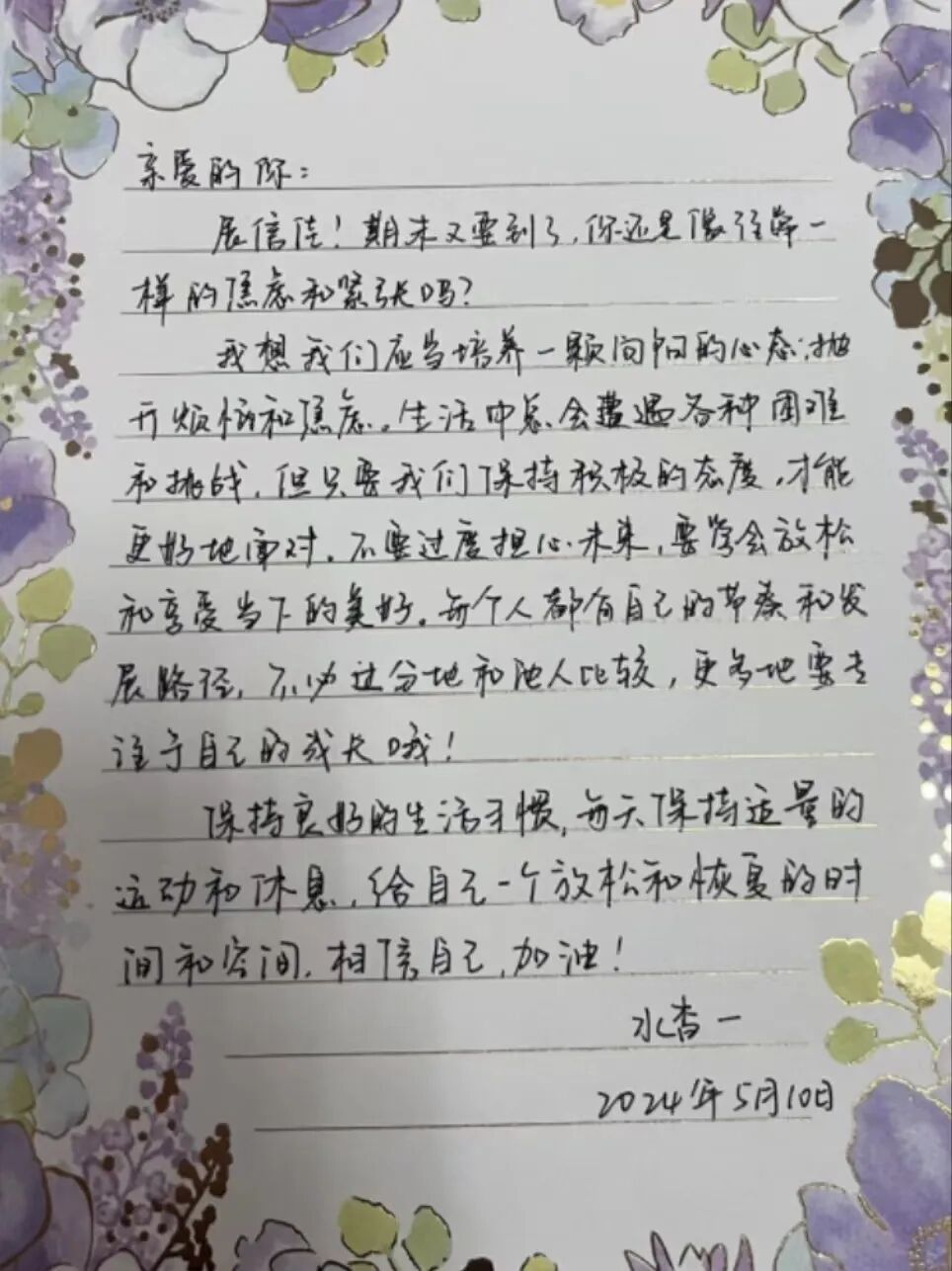 为深入学习贯彻习近平总书记关于学生心理健康工作的重要指示批示精神,培养学生自尊自信、理性平和、积极向上的健康心态,树立正确的世界观、人生观和价值观,进一步提升心理育人工作质量,管理工程学院与数字建造学院组织承办了一场以“心语传情”为主题的心理书信征文活动。以促进学生身心健康全面发展,让学生内心的声音得到释放和回应。