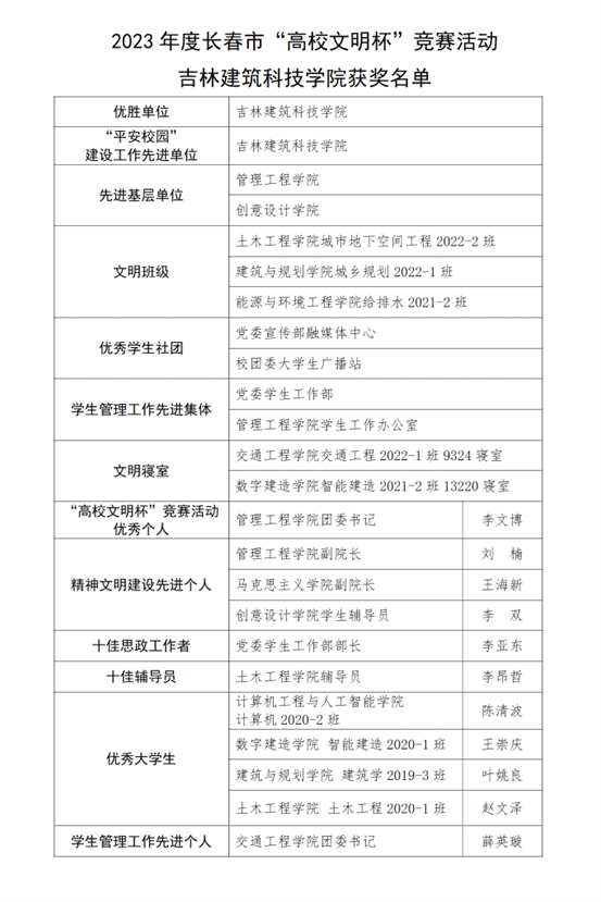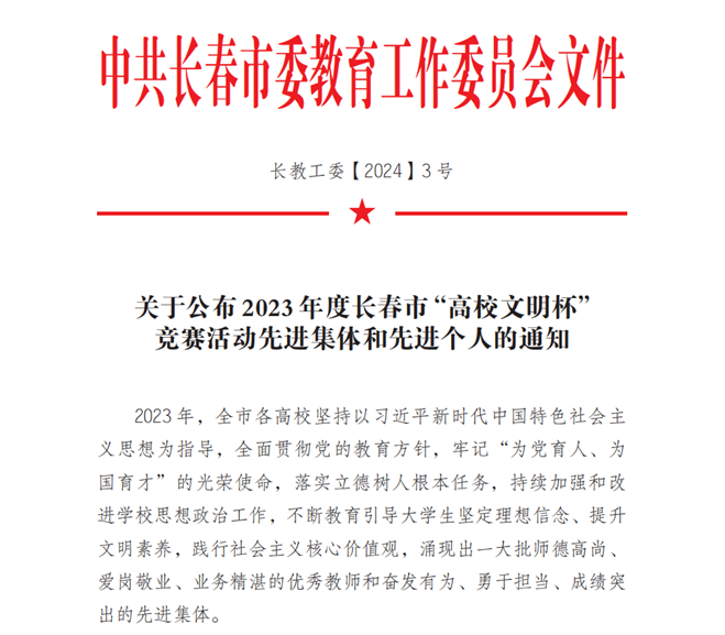 近日,中共长春市高等学校工作委员会下发《关于表彰2023年度长春市“高校文明杯”竞赛活动先进集体和先进个人的决定》,管理工程学院在竞赛活动中获得“先进基层单位”、“学生管理工作先进集体”;副院长刘楠老师获得“精神文明先进个人”、学院团委书记李文博老师获得“高校文明杯竞赛活动优秀个人”荣誉。