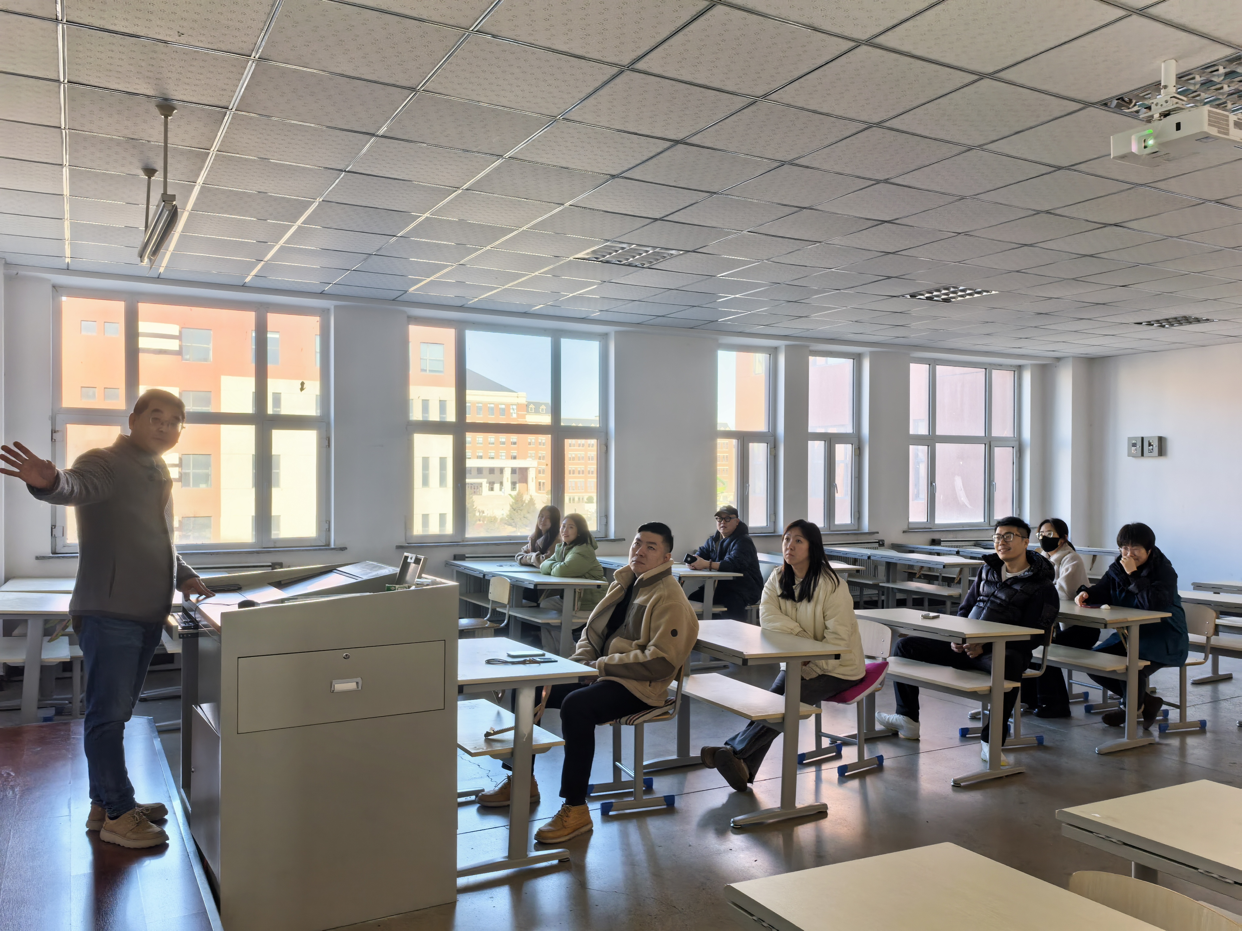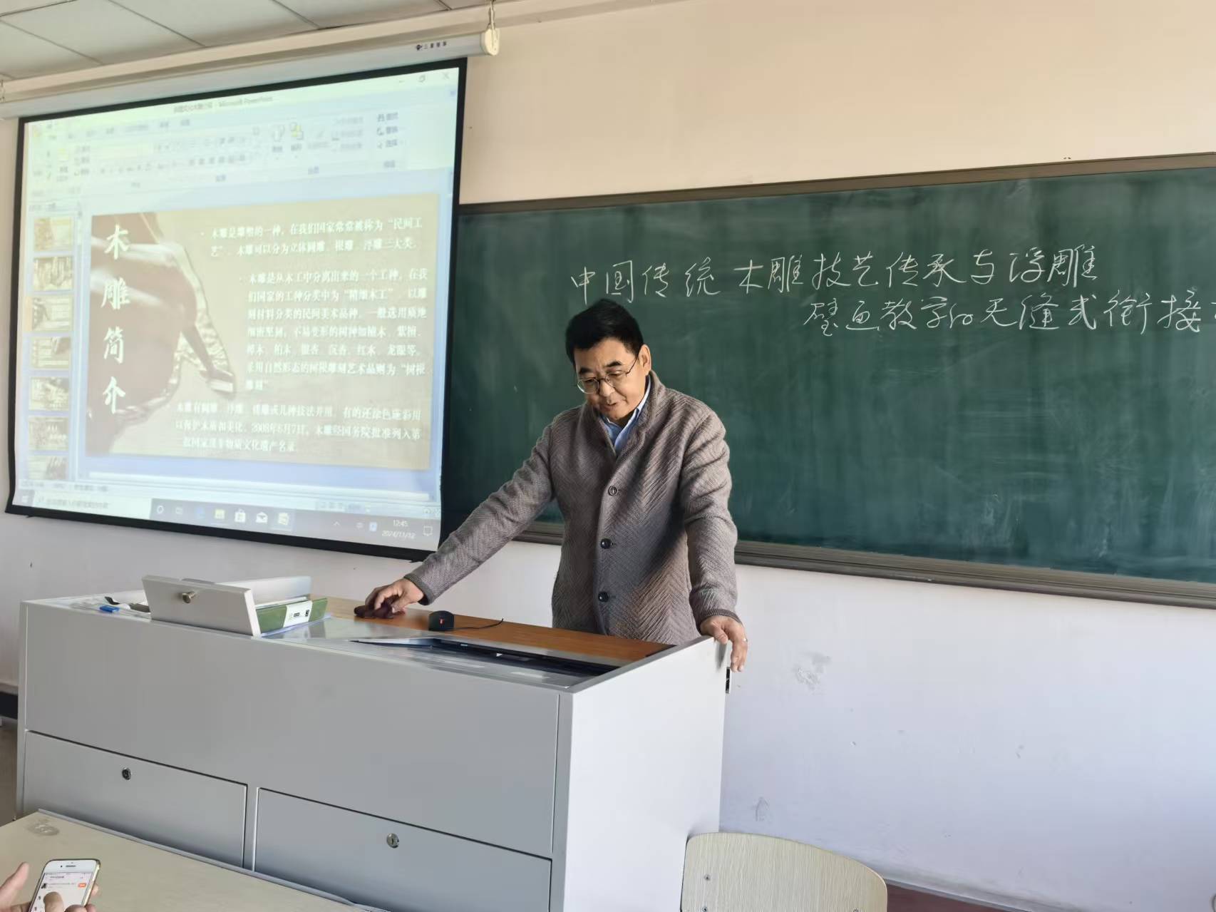 活动伊始,吕老师以《中国传统木雕技艺传承与浮雕壁画教学无缝式衔接构想》为主题,深入浅出地阐述了传统木雕技艺的产生发展及其发展演变的历程、设计方法及创作规律。详细讲解了传统木雕的艺术表现形式,代表流派,经典作品介绍,不仅让在场的青年教师了解传统木雕技艺知识,还在教学教法环节深受启发,更激发了大家对于如何以设计赋能中华优秀文化创新发展的思考。 随后,公共教研室主任杨印老师针对现代机雕与传统木雕技艺的区别与异同做了热情发问,引发传统技艺传承的讨论,大家都积极发言,突出了专业热情。