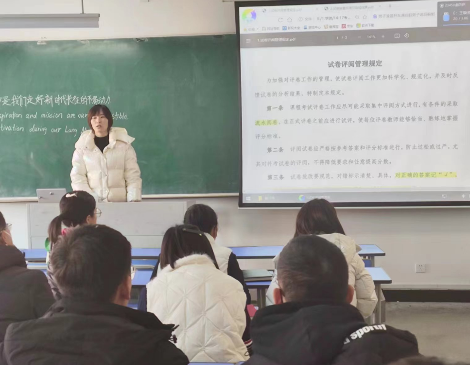 首先,王璇助理对《试卷评阅管理规定》逐条逐项进行讲解分析,并结合期中教学检查当中暴露出来的相关问题加以分析,警示大家吸取经验,严格按照规定执行。