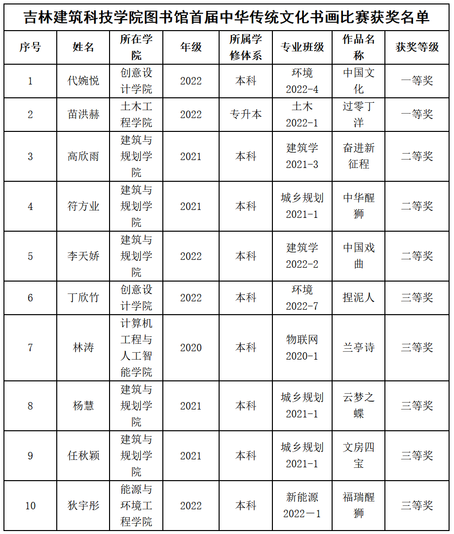 为深入学习贯彻党的二十大精神,认真落实“学校第十届书香校园建设系列活动暨首届“阅读中华悦动青春”大学生读书节”的工作部署和要求,丰富大学生的校园文化生活,学校图书馆联合各学院举办了“吉林建筑科技学院图书馆首届中华传统文化书画比赛”。 本次传统书画比赛活动,各学院积极动员学生参与,广大同学积极报名参加。此次比赛活动共收到集硬笔字、毛笔字书法作品以及各种绘画作品90件。传统书画比赛活动邀请创意设计学院陈希文副院长担任评选小组组长,评选出一等奖2名,二等奖3名,三等奖5名。此次参赛的作品中,书法作品风骨雄健,奔放轩昂;绘画作品笔触精到,着墨巧妙;手工作品独具匠心,精雕细琢,受到评委老师的极高赞誉。 本次活动展现了我校学生对书画的独特韵味和对中国传统文化学习的浓厚情趣,丰富了学生的校园文化生活,为书香校园建设助力。