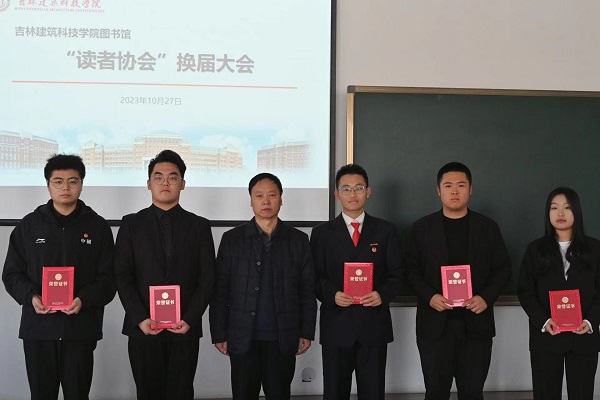 首先,吴博老师宣布了新一届吉林建筑科技学院图书馆“读者协会”会长、副会长、各部部长人员名单。接着,董荣馆长分别向会长施翔远、副会长吴边和各部部长发放聘书,并合影留念。