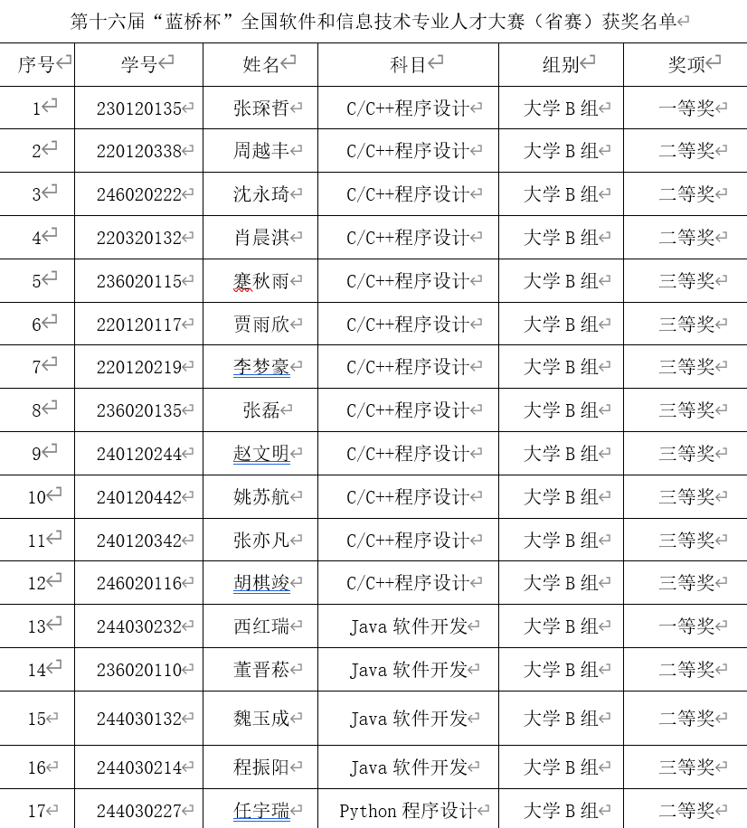 今日,第十六届蓝桥杯大赛公布赛果,我校计算机工程与人工智能学院17名学生获得省级奖项,其中省级一等奖2人,二等奖6人,省级三等奖9人。
