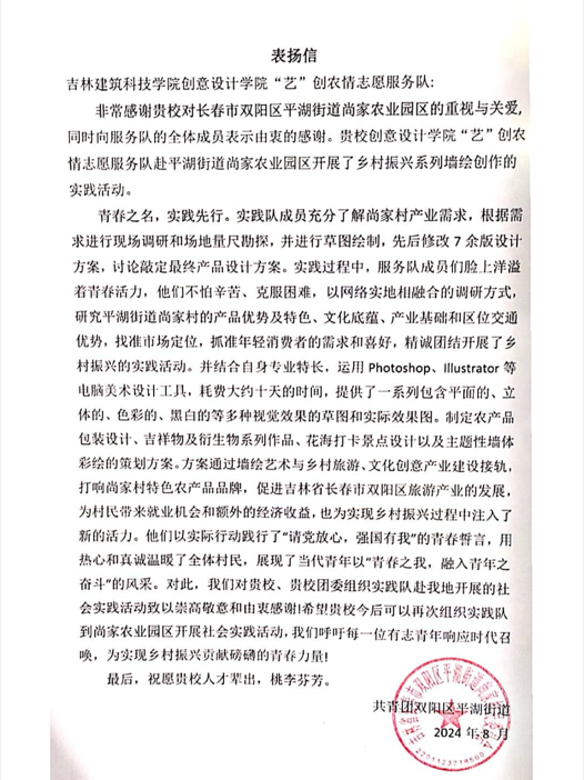 平湖街道领导及村民委员会表示,吉林建筑科技学院创意设计学院“艺”创农情志愿服务队的到来,不仅为园区带来了新鲜的创意与灵感,更为乡村振兴工作注入了强劲的动力。感谢信中,园区负责人高度评价了志愿者们的辛勤付出与卓越贡献,称赞他们是“乡村振兴路上的青春使者”。