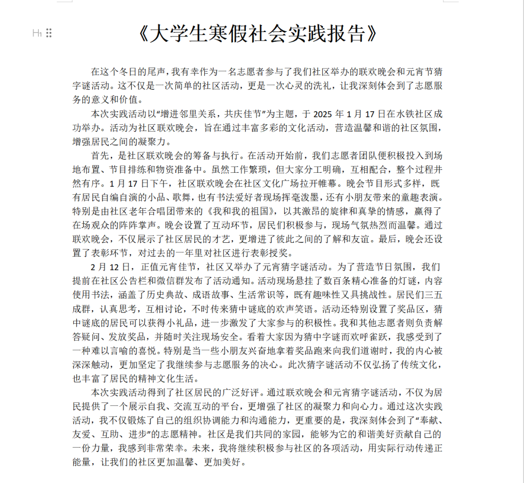 文化活动中,同学们在元宵节组织猜灯谜、做元宵等民俗项目,营造浓厚节日氛围,增强了社区凝聚力。参与基层工作时,认真协助处理文件整理、信息统计等事务,保障社区有序运转。通过线上线下结合的方式宣传本地优秀传统文化,提升了居民的文化认同感。关爱孤寡老人行动里,同学们送物资、陪聊天,给予老人们精神关怀。