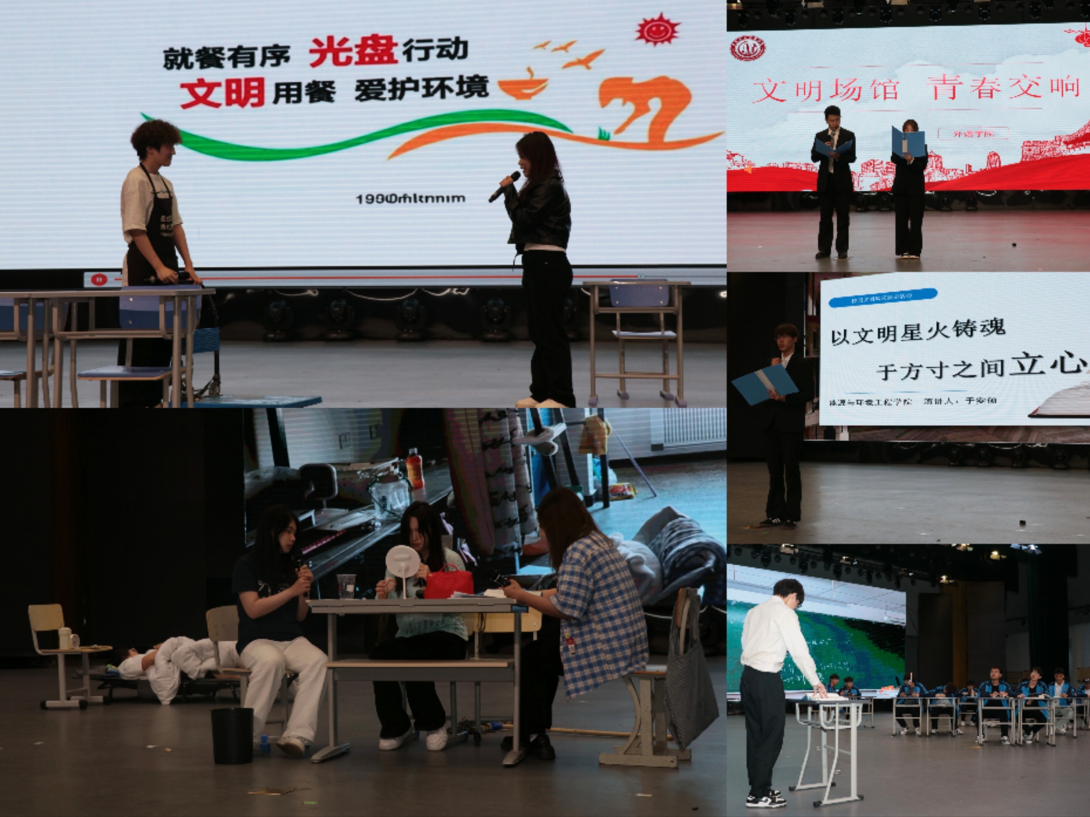 首先是各学院带来的精彩节目,他们以寝室文明、食堂文明、教室文明、场馆文明、人际交往文明、图书馆文明、校园公共场合文明、集体活动与仪式文明八个高校生活高频场景为设定,以情景剧、诗朗诵等形式生动诠释了大学生该有的文明礼仪规范。