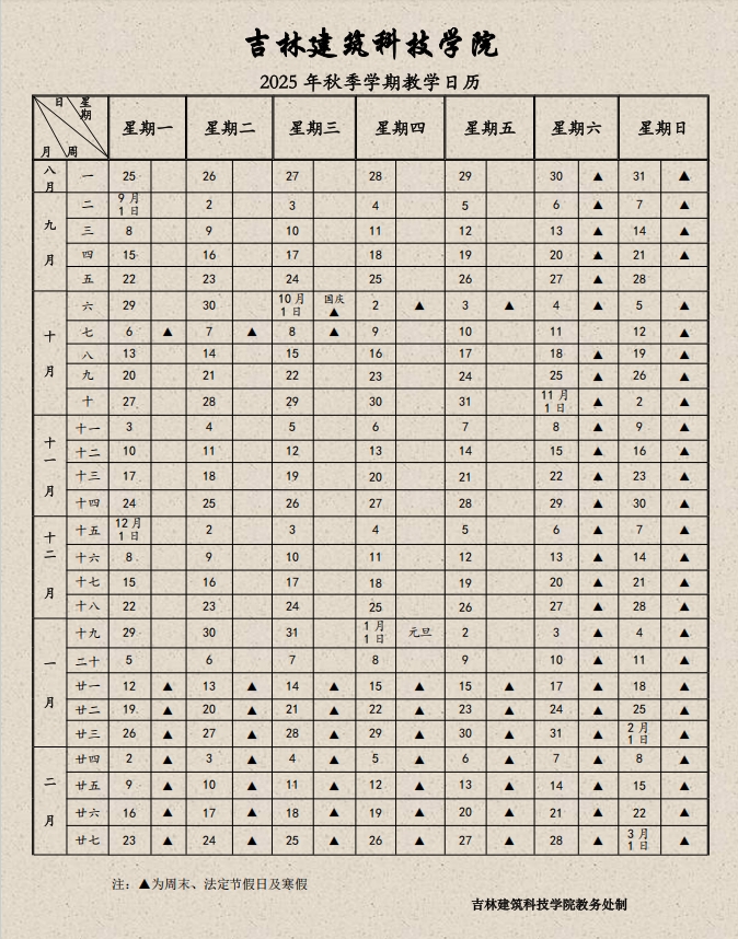 】2025年秋季学期教学日历