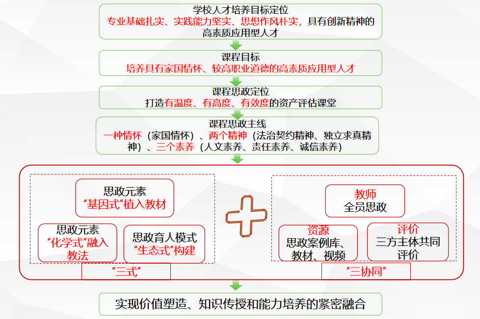 《资产评估原理》为资产评估专业的核心课程。课程依据学校“培养专业基础扎实、实践能力坚实、思想作风朴实”的人才培养目标定位,基于专业培养具有家国情怀的应用型人才目标,构建了“一种情怀(家国情怀)、两个精神(法治契约精神、独立求真精神)、三个素养(人文素养、责任素养、诚信素养)”的课程思政育人主线,并作为建设方向和重点。