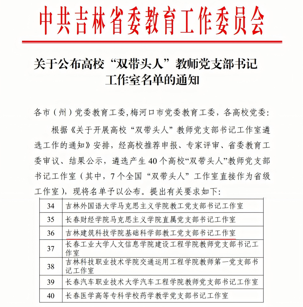 ▲基础科学部教工党支部入选吉林省高校“双带头人”教师党支部书记工作室