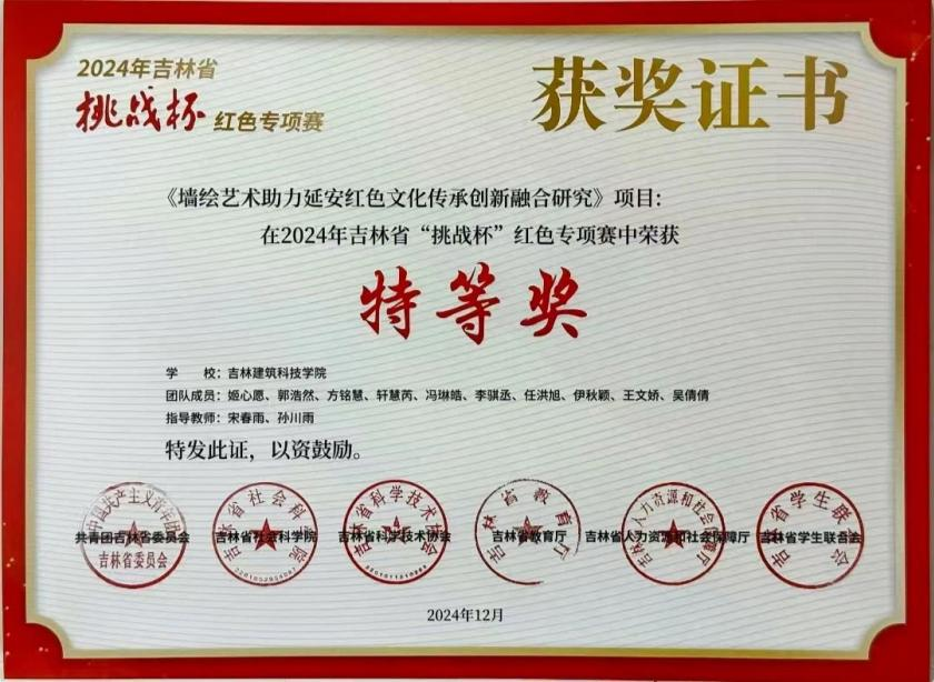 在吉林省“挑战杯”大学生红色专项赛中,学院学子凭借深厚的艺术功底与创新思维,荣获特等奖1项、二等奖1项。作品深入挖掘延安精神与吉林本地红色资源,通过可视化设计探索红色文化的当代传播路径,展现了青年学子传承红色基因、践行使命担当的青春力量,实现了思政教育与专业实践的深度融合。