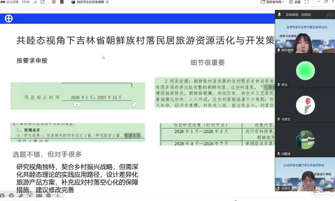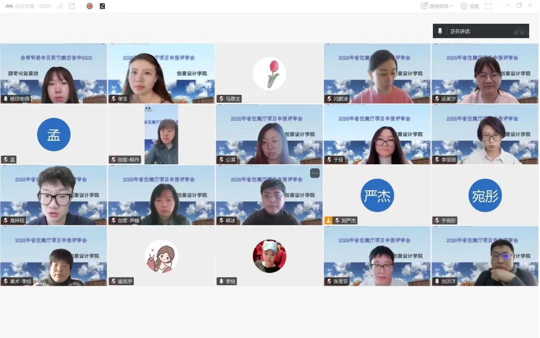 2026年1月20日,创意设计学院线上召开“吉林省住建厅项目申报优化与方向调整系列评审会”。会议围绕省住建厅软科学项目申报要求,对全院申报书开展集中评审与答辩指导,重点聚焦选题契合、研究聚焦、成果匹配与格式规范等问题,推动申报质量与命中率整体提升。学院院长柳丹教授高度重视,全程参会指导并作开场发言,答辩会中针对每位老师的申报书都前后做精彩细致点评;会议由院长助理杨印副教授主持,住建厅评审专家刘洪洋、美术教研室主任于佳副教授担任专业评审指导老师。