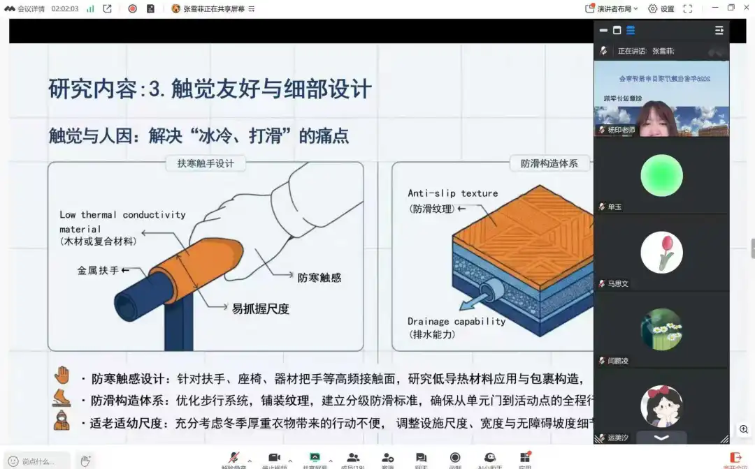 评审交流环节中,环境、风景园林、基础等教研室多个项目依次答辩,专家与评审教师围绕适老化公共环境优化、寒地社区公园与慢行网络、城市更新与精细化治理、传统村落建筑装饰构件数字化保护、高品质住宅评价体系等方向逐项研判。