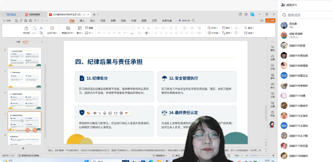 随后,围绕《吉林建筑科技学院学生实习安全协议书》核心条款开展针对性安全讲解。结合动画专业实习实际,苏主任重点解读交通出行、岗位操作、外出管理等关键安全规范,明确要求学生严禁搭乘非营运或手续不全、无安全保障的营运车辆,实习期间未经批准不得擅自离开实习单位、前往危险区域或组织无安全保障的集体外出活动等。