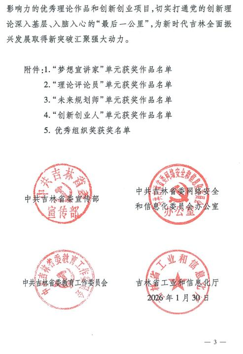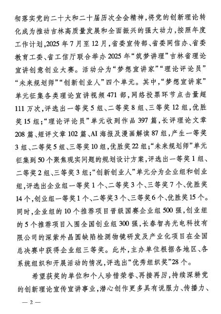 本次大赛自2025年7月启动,以“理论宣讲+创意创业”为导向,设置“梦想宣讲家”“理论评论员”“未来规划师”“创新创业人”等单元,面向高校师生及相关领域从业者征集作品,鼓励以创新表达推动理论传播、以方案设计服务地方发展。“未来规划师”单元在全省征集50个聚焦现实问题的规划设计方案,前20名方案于2025年12月17日在省“学习强国”宣讲学院进行决赛,现场评选出一等奖1组、二等奖2组、三等奖3组。前十名作品由吉林省委宣传部整理后形成省级智库报告。