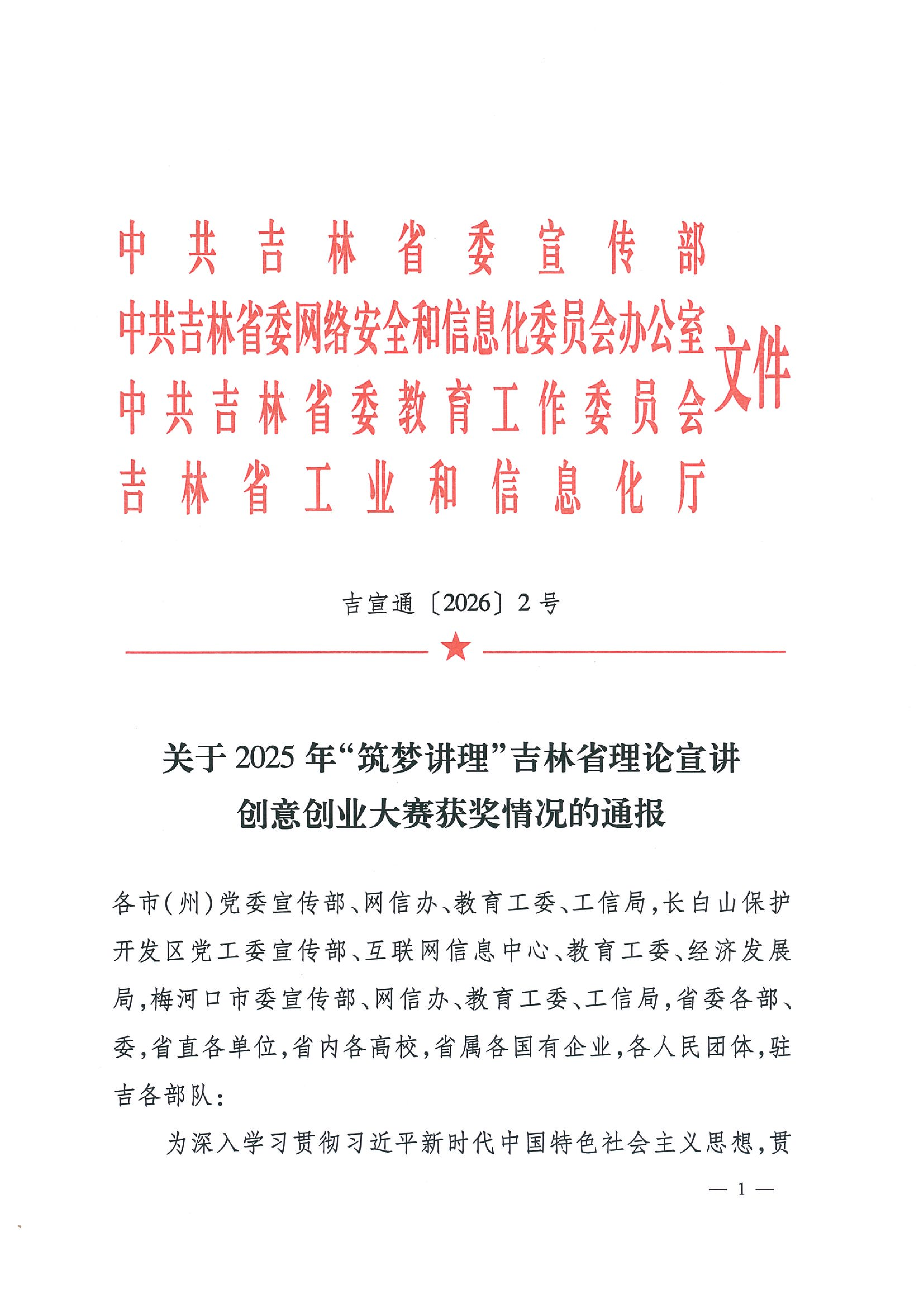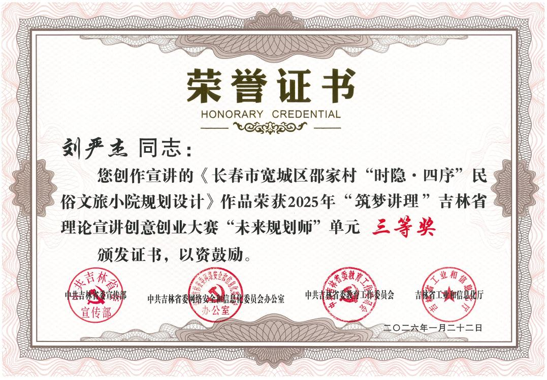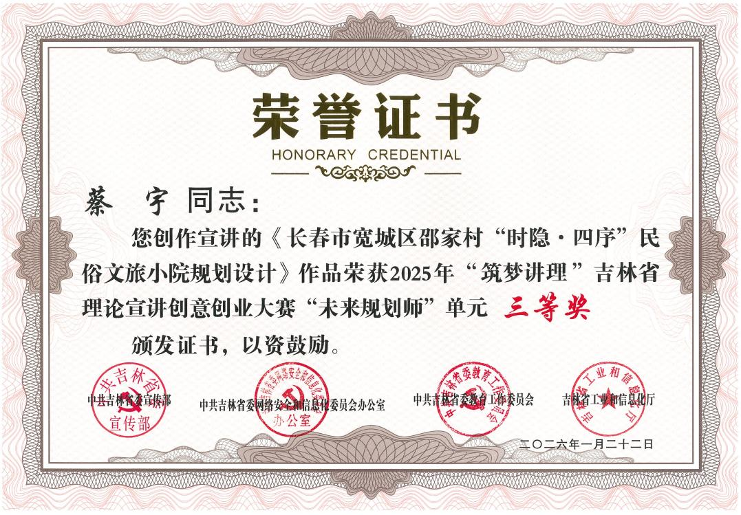 近日,中共吉林省委宣传部、省委网信办、省委教育工委、省工信厅联合发布2025年“筑梦讲理”吉林省理论宣讲创意创业大赛获奖通报。我校创意设计学院柳丹、蔡宇、刘严杰、孙怡菲师生团队申报的设计项目《长春市宽城区邵家村“时隐·四序”民俗文旅小院规划设计》在大赛“未来规划师”单元中荣获三等奖。
