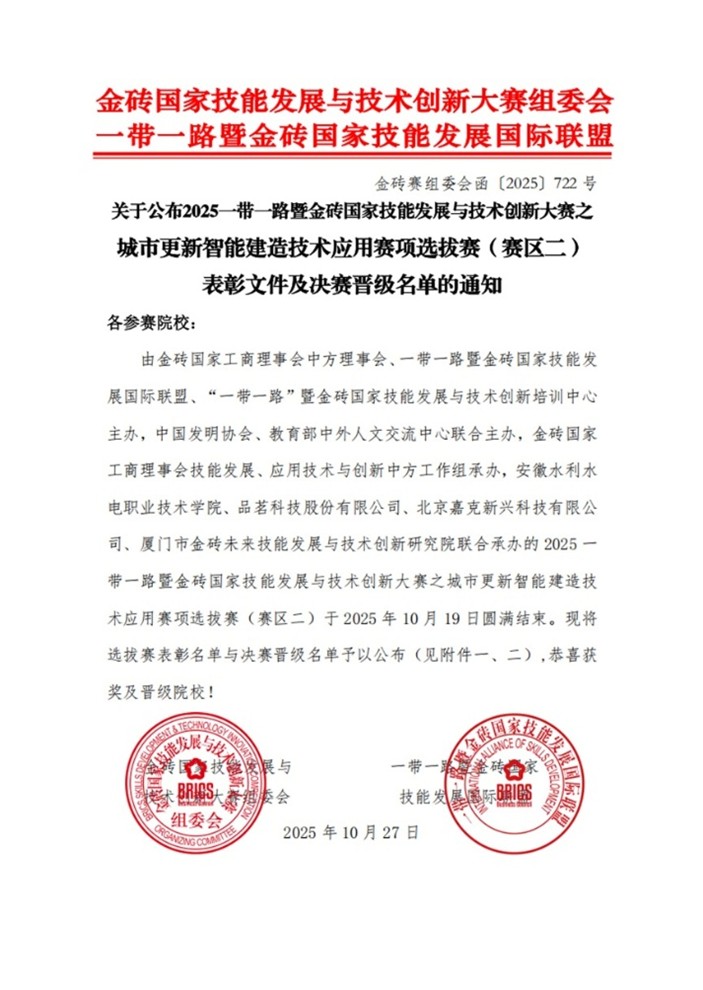 近日,2025“一带一路”暨金砖国家技能发展与技术创新大赛之城市更新智能建造技术应用赛项选拔赛(赛区二)圆满落下帷幕。由金砖国家工商理事会中方理事会、“一带一路”暨金砖国家技能发展国际联盟、中国发明协会等单位联合主办的本次大赛,旨在推动智能建造与城市更新领域的技术交流与创新发展。来自全国多所高校的优秀代表队在赛场上同台竞技,展示了新时代青年在智能建造领域的创新能力与专业素养。