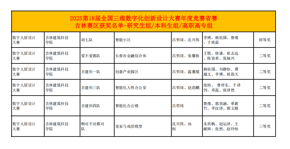 近日,第 18 届全国三维数字化创新设计大赛吉林赛区成绩正式公布,BIM 协会捷报频传 ,此前由吕哲琦老师带领出征的 6支参赛队伍,凭借扎实的专业素养与创新的设计方案斩获佳绩,其中 1 项作品获评特等奖并成功晋级全国总决赛,另有 4 项作品获二等奖、1 项作品获三等奖,在数字人居设计赛道交出亮眼答卷。