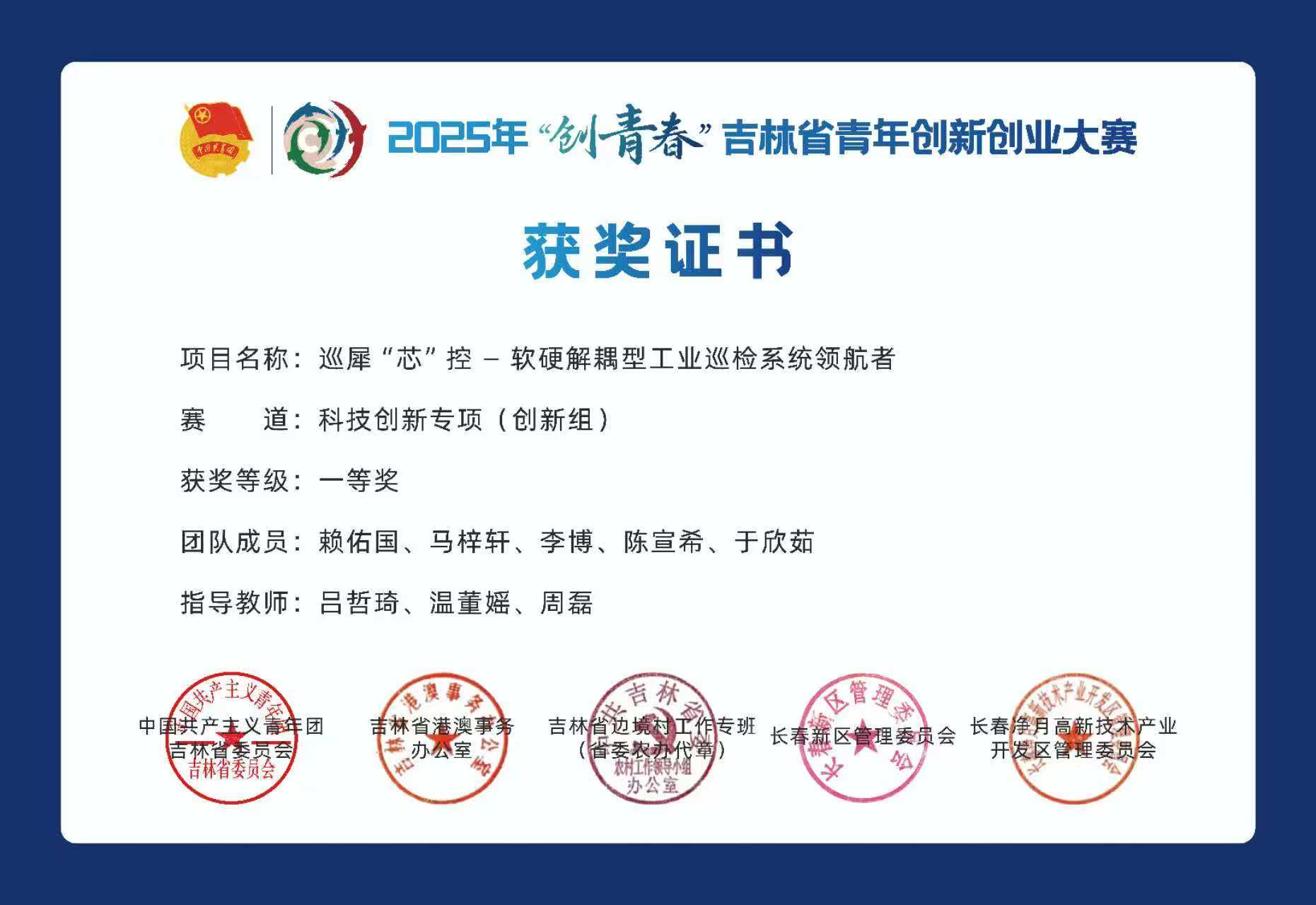 本次获奖的 “巡犀‘芯’控” 项目,聚焦工业巡检领域的效率与成本痛点,创新提出 “软硬解耦” 的系统架构 —— 通过模块化硬件适配与可定制化软件算法,实现工业场景下巡检设备的灵活部署与智能分析,既降低了传统巡检方案的适配成本,也提升了数据处理的精准度。项目团队由赖佑国、马梓轩、李博、陈宣希、于欣茹五位同学组成,在吕哲琦、温董瑶、周磊三位指导教师的全程指导下,团队历经项目调研、方案迭代、路演打磨等多个阶段,从技术原理验证到实际场景模拟,反复优化项目细节,最终在决赛现场凭借清晰的逻辑、专业的展示与从容的答辩,赢得了评委的高度认可。