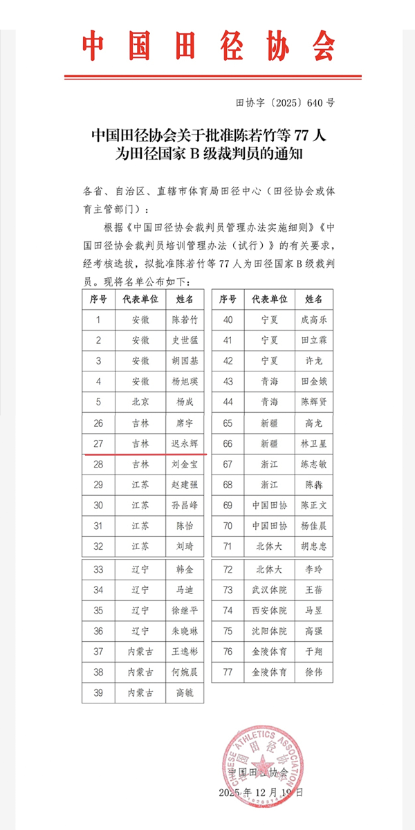 近日,中国田径协会发布《关于批准陈若竹等77人为田径国家B级裁判员的通知》(田协字〔2025〕640号),我部迟永辉老师凭借扎实的专业知识、丰富的赛事执裁经验和严格的考核表现,成功获批田径国家B级裁判员资质,这是对迟永辉老师专业能力的高度认可,也是我部体育教学与裁判人才培养工作的重要成果。