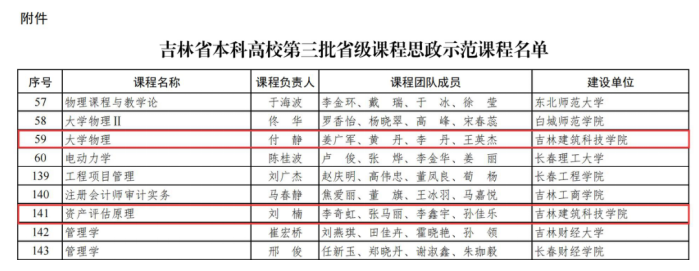 1.学校2门课程获批省级课程思政示范课程。日前,吉林省教育厅发布了《关于公布吉林省本科高校第三批省级课程思政示范课程名单的通知》,我校《大学物理》《资产评估原理》2门课程获批为省级课程思政示范课程。此次获批,充分反映了学校课程思政教学建设与改革的阶段性成效。下一步,学校将持续深化课程思政教学改革,充分发挥省级课程思政教学研究中心作用,聚焦课程思政教学实践和理论研究,积极探索创新课程思政建设方法路径及质量评价体系和激励机制,不断提高高水平课程思政示范课程数量,增加覆盖面。同时,进一步发挥示范课程的引领作用,及时总结、推广经验,以点带面推动全校课程思政建设水平提质升级,加快形成“门门有思政、课课有特色、人人重育人”的良好工作局面,切实提升人才培养质量,为培养担当民族复兴大任的时代新人贡献更大力量。