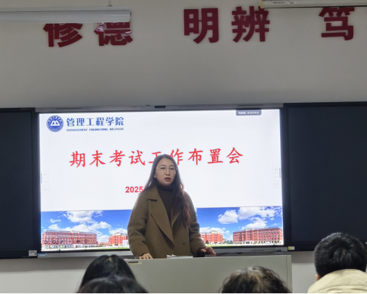 2.管理工程学院召开期末考试布置会。12月19日,管理工程学院在文管楼115召开期末考试工作布置会,全面部署期末各项教学与管理工作。会议围绕期末教学工作的规范性与系统性展开,教学副院长钟欣重点强调了期末考试的组织安排、巡考督查、试卷命题与批阅、课程设计归档等工作要求。强调期末考试是检验教学质量的重要环节,全体教师应严格按照学校规范执行,确保考试公平、严谨、有序。
