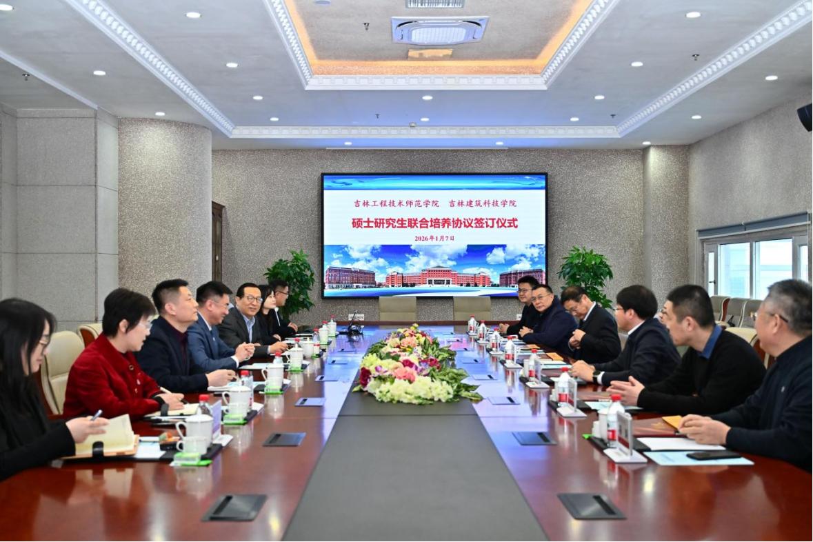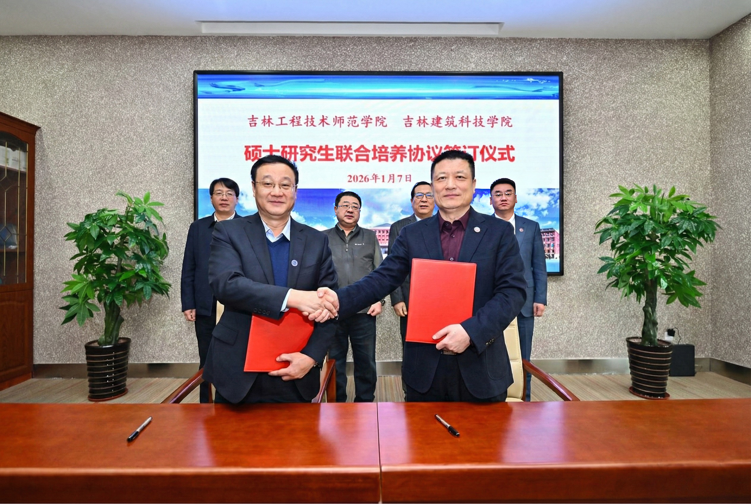 2026年1月7日下午,吉林建筑科技学院与吉林工程技术师范学院隆重举行了硕士研究生联合培养协议签订仪式。吉林工程技术师范学院党委书记刘剑桥,党委副书记、校长王洪福,党委常委、副校长刘克平;吉林建筑科技学院董事长陈怡天,校长,党委副书记、副校长刘春宇出席仪式,双方相关职能部门负责人参加仪式。