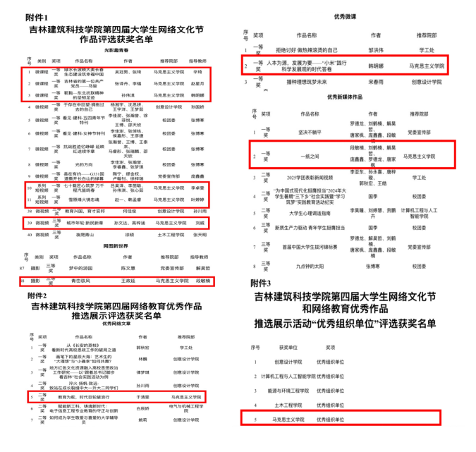 近日,吉林建筑科技学院第四届大学生网络文化节暨网络教育优秀作品推选展示活动圆满落幕,马克思主义学院凭借教师团队的专业指导,与学生协同发力,斩获11项荣誉,育人成效凸显。