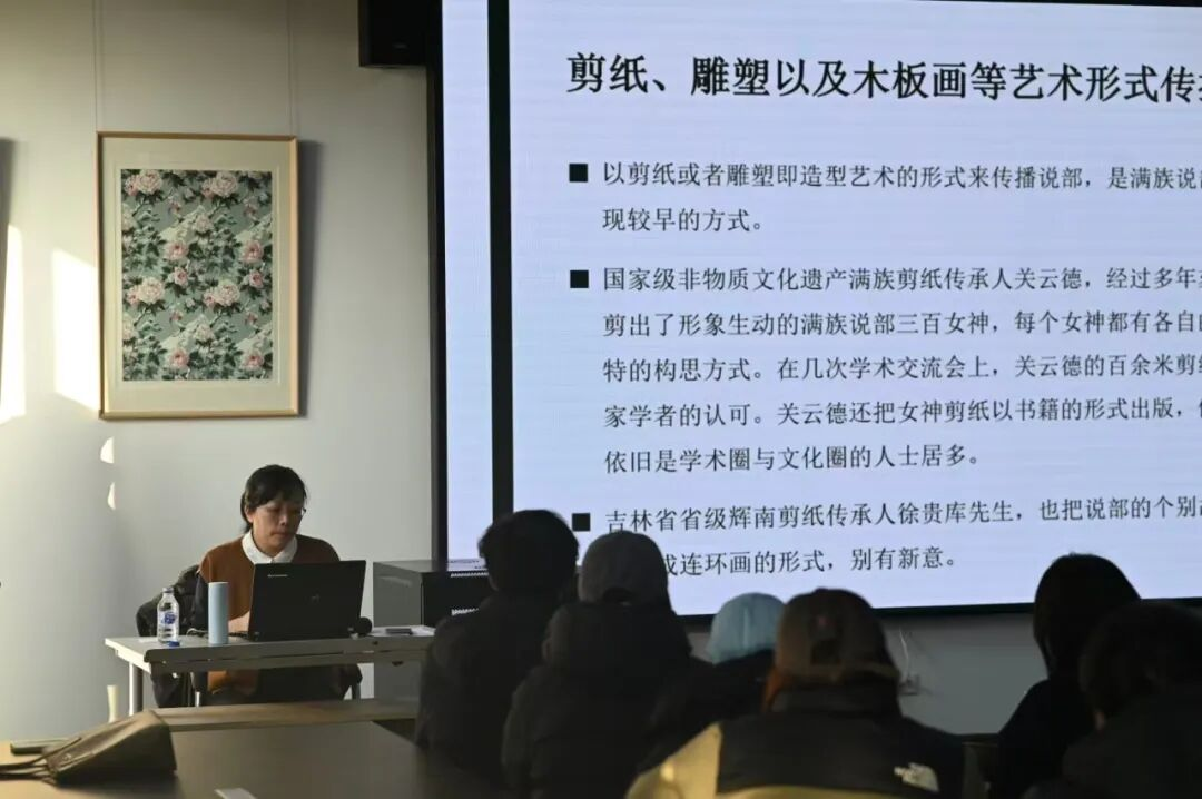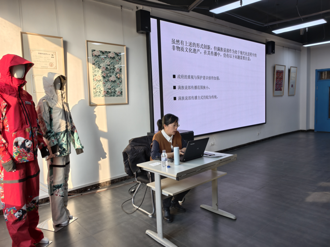 报告着重强调,非遗的活态保护与可持续传承,离不开学术研究与学校教育的深度联动。唯有依托省级学会平台整合学术研究力量,借助全媒体传播扩大文化影响力,推动满族说部进校园、进课堂,方能让年轻一代深度认知满语文化内核与民族精神谱系,从根源上优化传承生态。同时,邵丽坤老师结合国内外非遗保护政策法规演进历程,深入阐释了文旅深度融合的政策背景与实践意义,为创意设计师生的跨界创新提供了坚实理论支撑。
