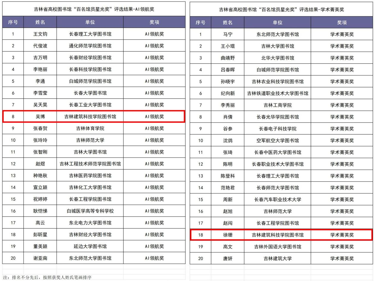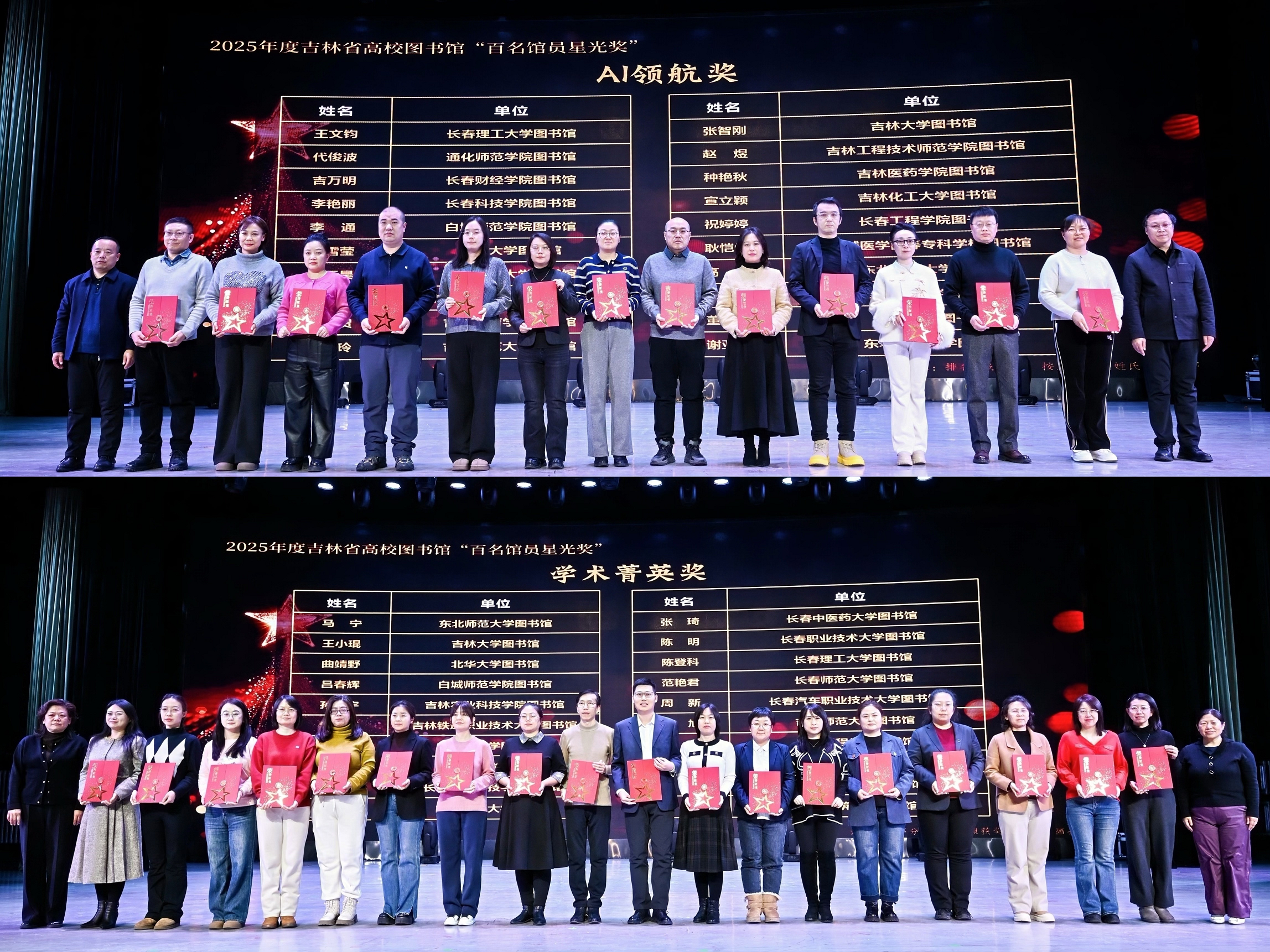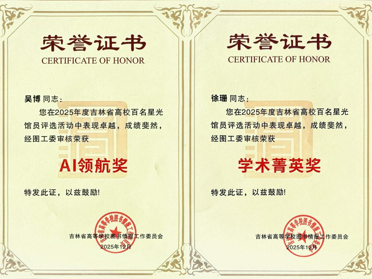 近日,2025年度吉林省高校图书馆“百名馆员星光奖”评选结果正式揭晓,我校图书馆吴博、徐珊两位老师凭借在专业领域的突出贡献与卓越成就,分别荣获 “AI领航奖”与“学术菁英奖”,为学校赢得荣誉,充分彰显了我校图书馆在学术研究与智慧技术应用领域的强劲实力与鲜明风采。