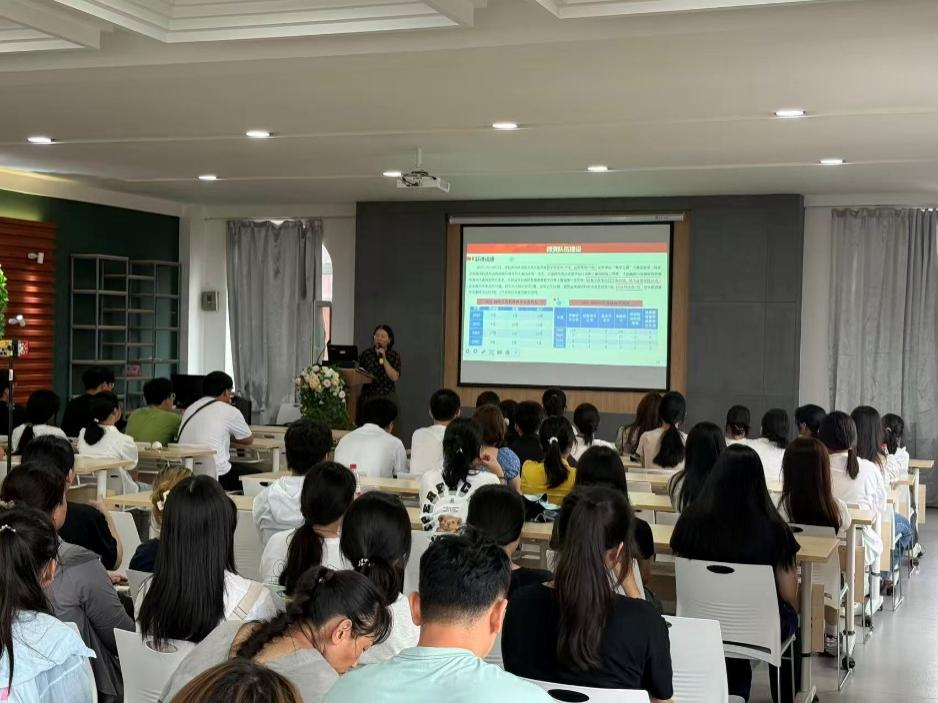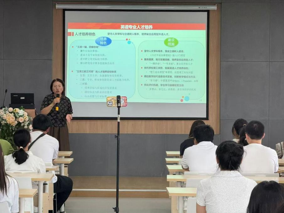外语学院院长韩松首先代表学院全体师生,向新生及家长致以热烈欢迎。随后,她以“院长带你读懂外语专业”为主题展开分享,详细介绍了学院英语专业的核心课程——包含跨境电商、文学翻译、跨文化交际等特色方向,以及由资质经验丰富的教师组成的师资团队,同时展示了近年学子在全国大学生英语竞赛以及省级大赛中的亮眼成果。她强调“外语是打开世界的钥匙”,鼓励新生既要筑牢听、说、读、写、译的语言根基,也要主动参与“外语角”“翻译工作室”等实践平台,朝着“语言+技能”的复合型人才方向努力。