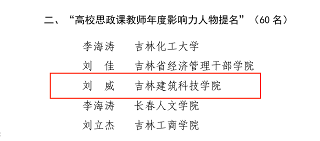 近日,吉林省教育厅公布了2025年吉林省“高校思政课教师年度影响力人物”评选结果。马克思主义学院刘威入选吉林省“高校思政课教师年度影响力人物提名”。