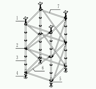 1-可调托撑;2-盘扣节点;3-立杆;4-可调底座;5-基座;6-竖向斜杆;7-水平杆