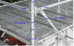 4.斜杆diagonal brace两端装配有扣接头,可与立杆上的连接盘扣接的斜向杆件。