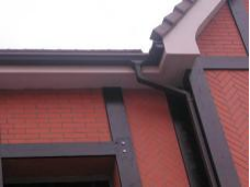 外排水檐沟悬挂在坡屋顶的挑檐处,应采用镀钵薄钢板或石棉水泥等轻质材料制作,水落管则仍可用铸铁、塑料、陶瓦、石棉水泥、PVC等材料。檐沟的纵坡一般由檐沟制 挂形成,不宜在沟内垫置材料起坡。