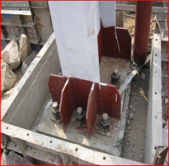 在钢柱与混凝土基础之间能将柱端应力降低到低于混凝土强度,并能将柱固定在基础上的过渡部分即为柱脚。