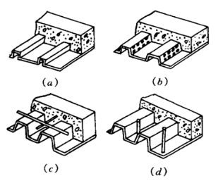 压型钢板与现浇混凝土形成组合板的前提是压型钢板能与混凝土共同作用。因此,必须采取措施使压型钢板与混凝土间的交界面能相互传递纵向剪力而不发生滑移。目前常用的方法有: