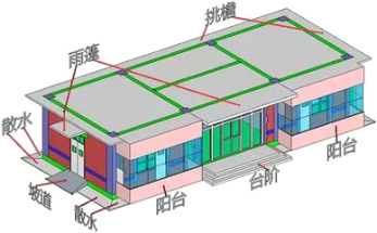 一般沿房屋周圈挑出的板,在屋顶处套挑檐;雨蓬一般位于门的顶部,宽度一般比门略为宽点,顶层阳台处的一般也套雨蓬。