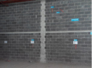 在房屋四角或楼梯间转角处设立皮数杆,皮数杆间距不得超过15m。皮数杆上应画出各皮小砌块的高度及灰缝厚度。在皮数杆上相对小砌块上边线之间拉准线,小砌块依准线砌筑。
