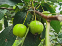 果实近球形,直径1.5-2厘米,黄色,萼片宿存,基部不下陷,梗洼隆起;果梗细长,先端肥厚,长3-4厘米。花期4-5月,果期8-9月。
