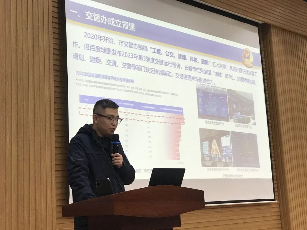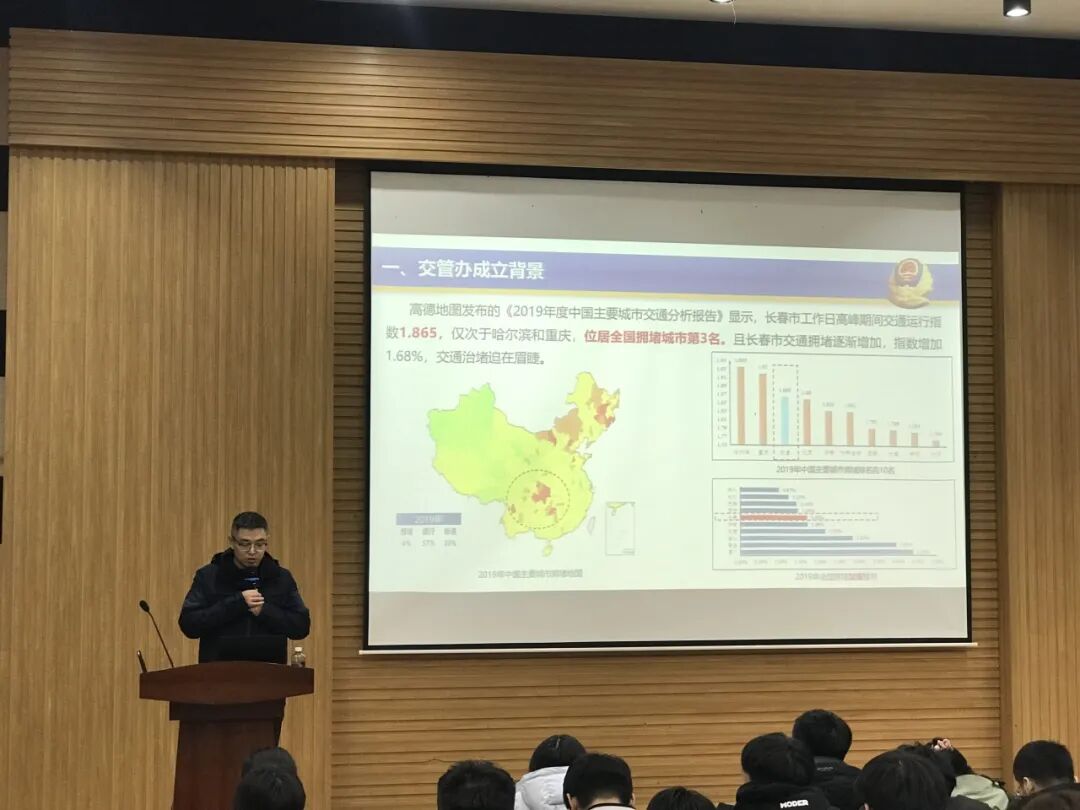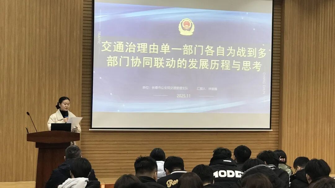 林警官长期深耕城市交通综合治理领域,主导推进长春市快速路、主干路及商圈、学校、医院等热点区域多项交通治理举措,成效显著。报告会上,林俊巍警官首先向广大师生介绍了长春市自2020年以来取得的交通治理成果。长春市公安局交通管理支队交通秩序管理大队交通管理委员会办公室联合长春规划部门、交通研究部门、建设部门,在省市领导的带领与支持下,进行“组合拳”式策略研究,对交通管理进行科技赋能、数据赋能,多部门联合协作,使长春市的交通拥堵问题得到了有效的治理。2024年公安部交管局《36个大城市交通运行与治理对比分析报告》中,长春市被评为交通管理A级城市,在同等城市中位列第一。报告会上,林警官还向广大师生介绍了长春市公安局交通管理支队治理的典型道路节点。包括和美路口通行效率的提升,吉林大学医院门前拥堵的治理,红旗商圈交通人车冲突治理等。