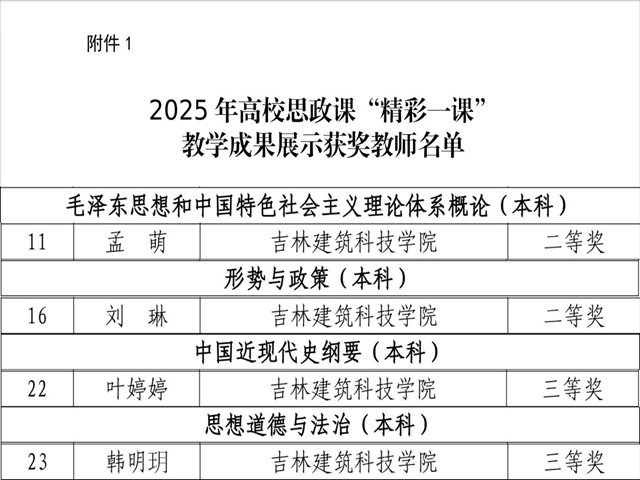 为深入贯彻习近平总书记关于学校思政课建设的重要指示精神,认真落实全国教育大会精神和第二十八次全国高校党的建设工作会议精神,省教育厅组织开展了2025 年高校思政课“精彩一课”教学展示活动。学校马克思主义学院教师在多个课程类别展示中表现突出:孟萌参加的《毛泽东思想和中国特色社会主义理论体系概论》教学成果展示获得“二等奖”;刘琳参加的《形势与政策》教学成果展示获得“二等奖”;叶婷婷参加的《中国近现代史纲要》教学成果展示获得“三等奖”;韩明玥参加的《思想道德与法治》教学成果展示获得“三等奖”。