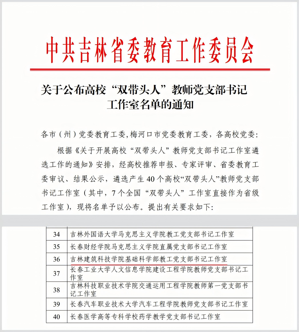 近日,吉林省委教育工作委员会正式公布高校“双带头人”教师党支部书记工作室名单,我校基础科学部教工党支部凭借扎实的党建基础、鲜明的工作特色和突出的育人成效成功入选,成为2025年入选的全省高校40个省级“双带头人”工作室之一。
